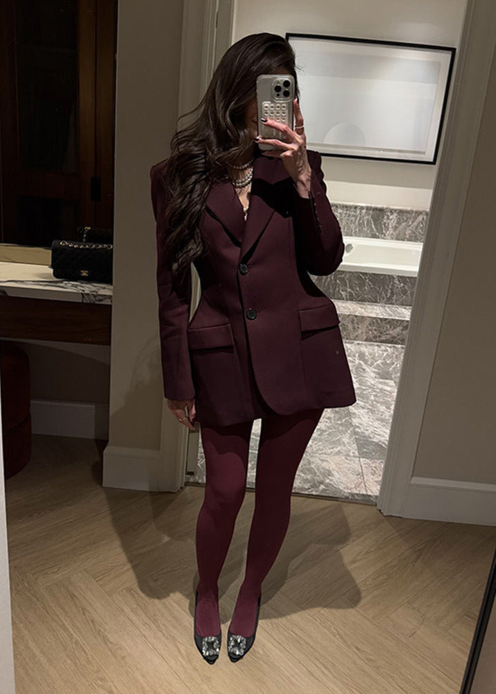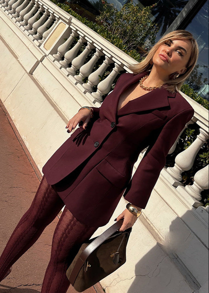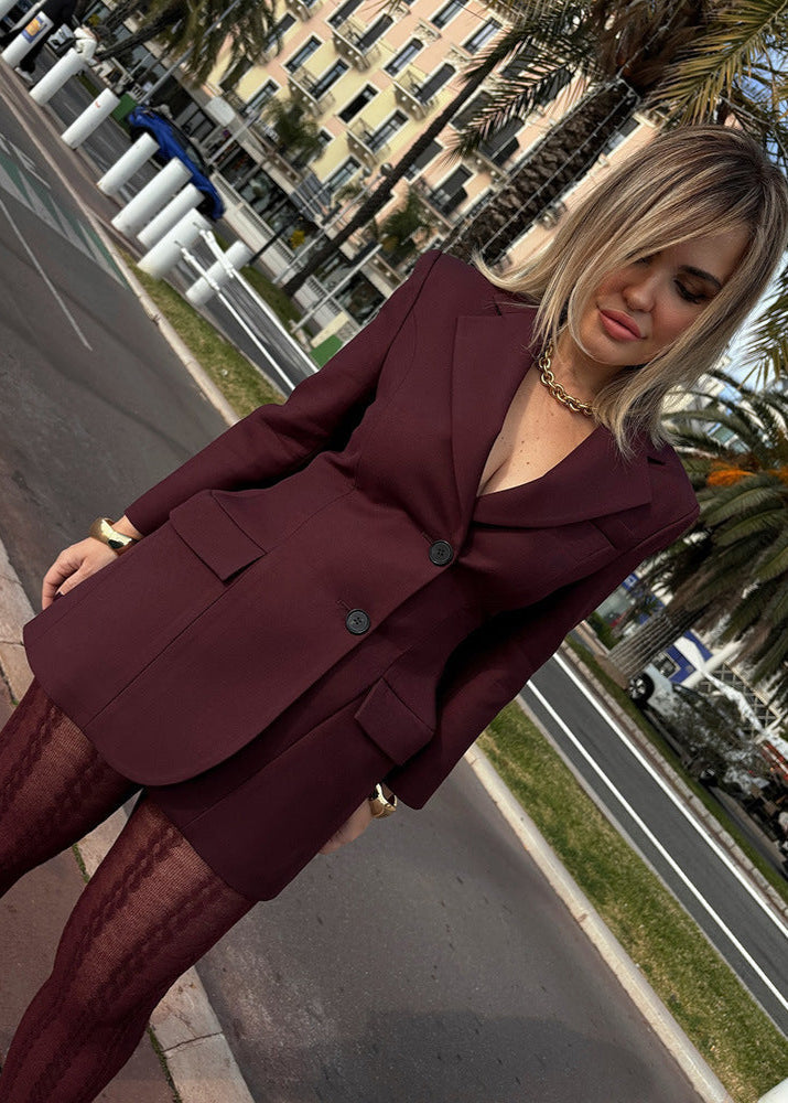 Luvik Tailored Blazer Dress mullistaa voimakkaan pukeutuneisuuden rohkealla ja elegantilla akcentilla. Sen rakenteellisen muodon, näyttävien kaulusten ja kaksinappisen suljennan ansiosta tämä bleiserimekko yhdistää tyylin nykyaikaiseen monikäyttöisyyteen. Käytännölliset läppätaskut ja räätälöity istuvuus mahdollistavat vaivattoman yhdistämisen näyttäviin leggareihin, tai sen voi pukea yksinään tyylikkäänä minimekkona. Täydellinen liiketalouspukeutumiseen, illan tapahtumiin tai rohkeisiin katutyyleihin.