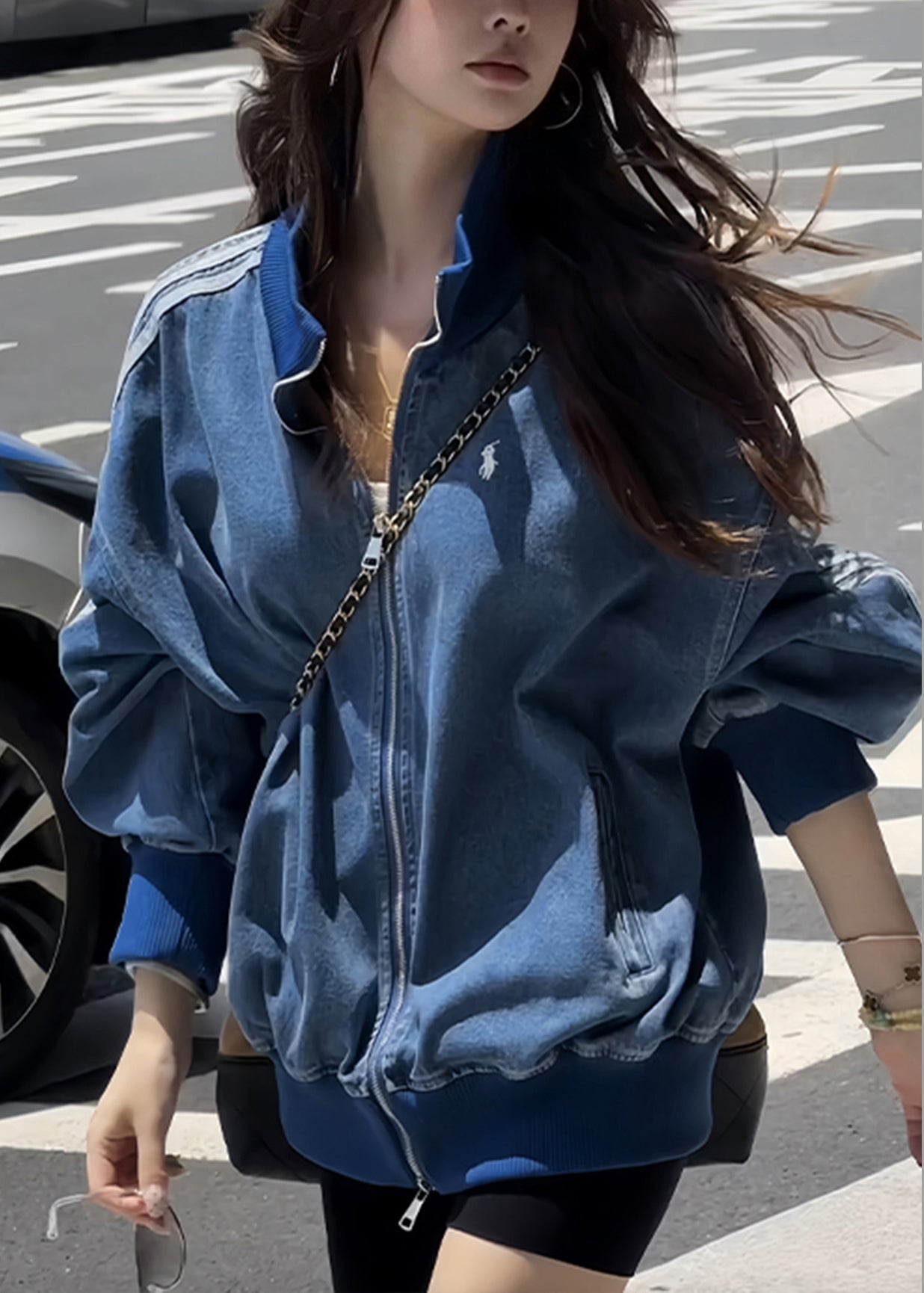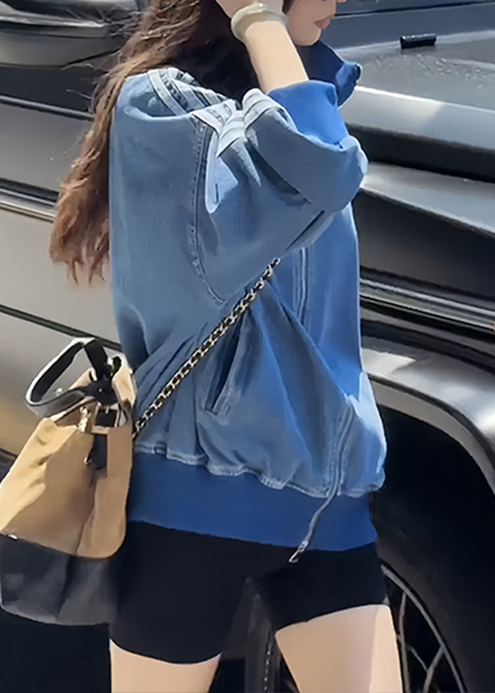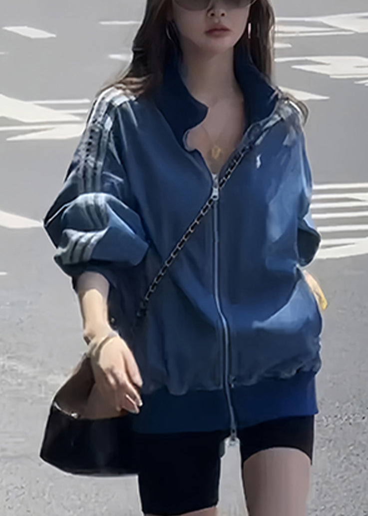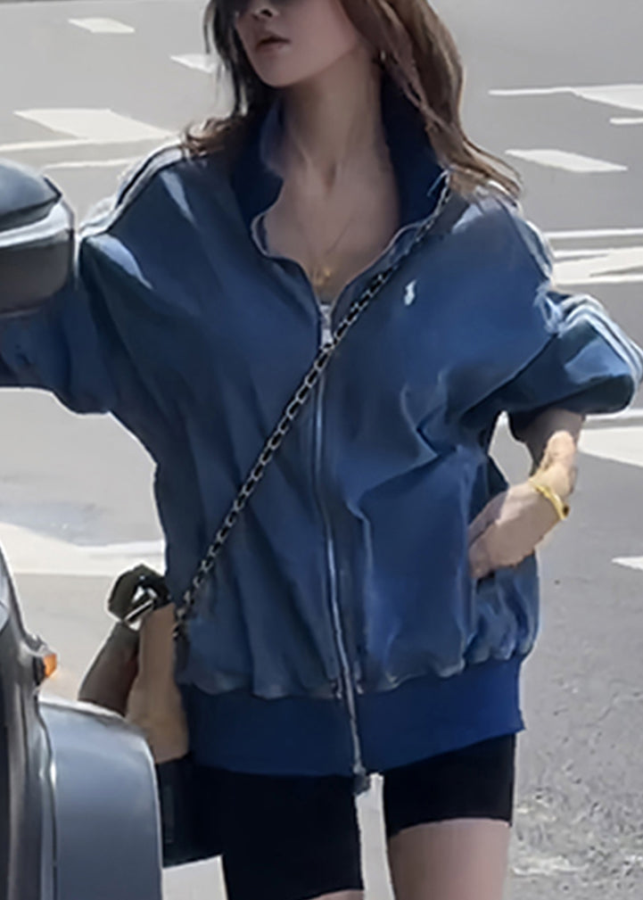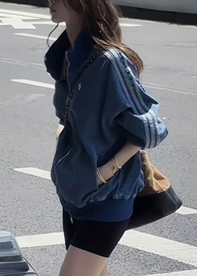 Luvik | V-kokoinen sininen farkkutakki vetoketjulla, raitoja ja taskuja