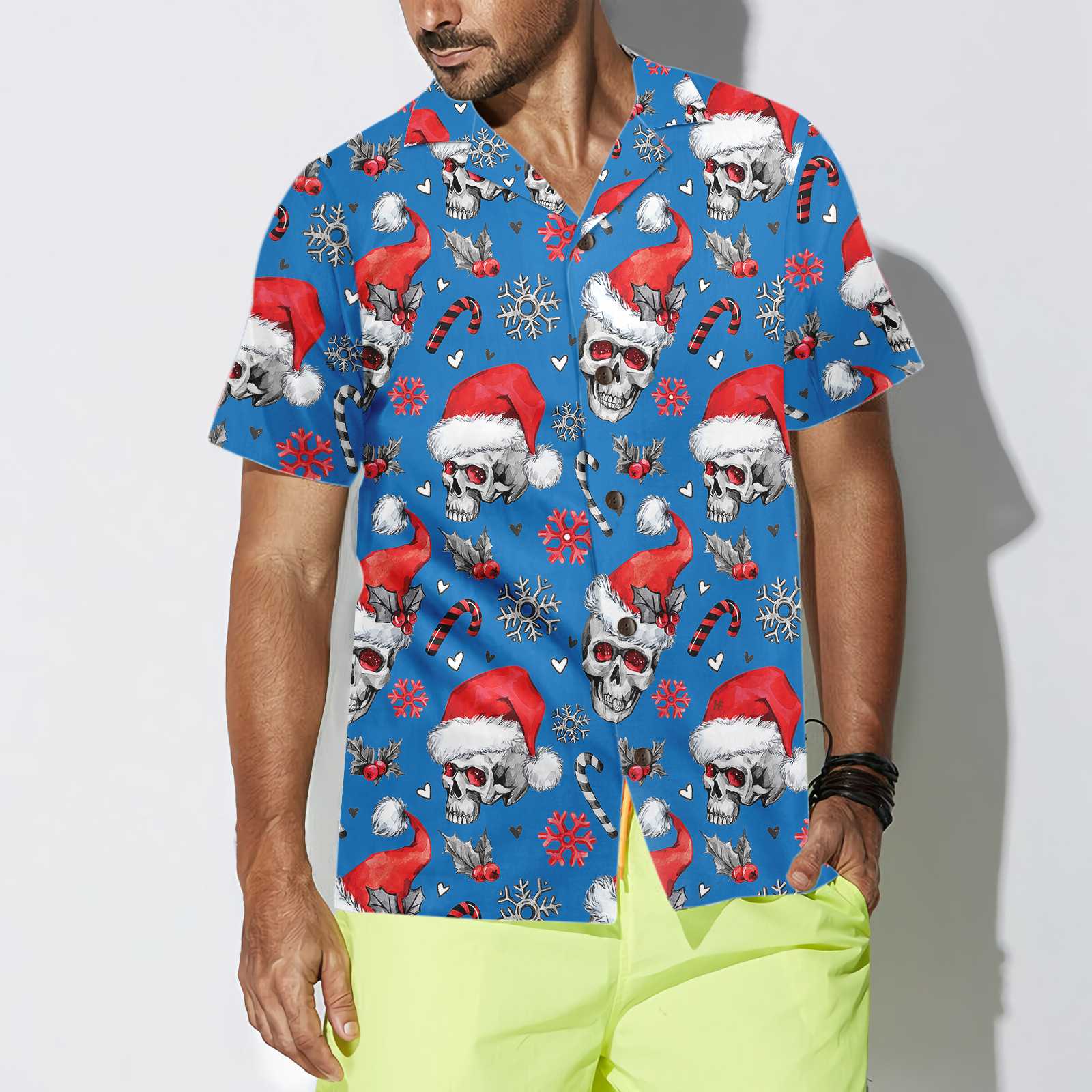 Luvik | Joulupäähine sokeripatukoilla Sininen versio Jouluhavaiji-paita, joulupäähinepaita miehille