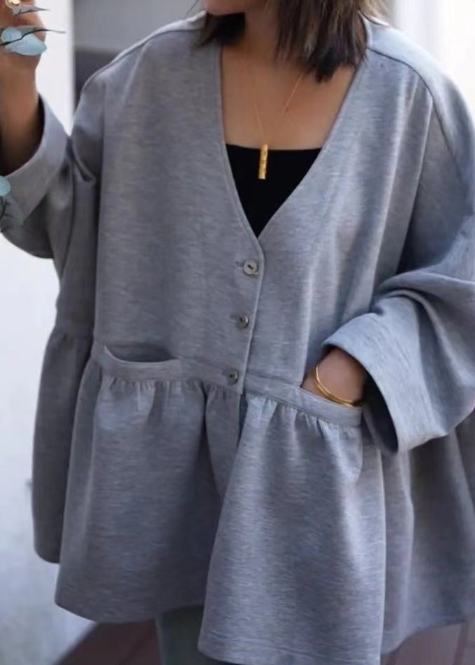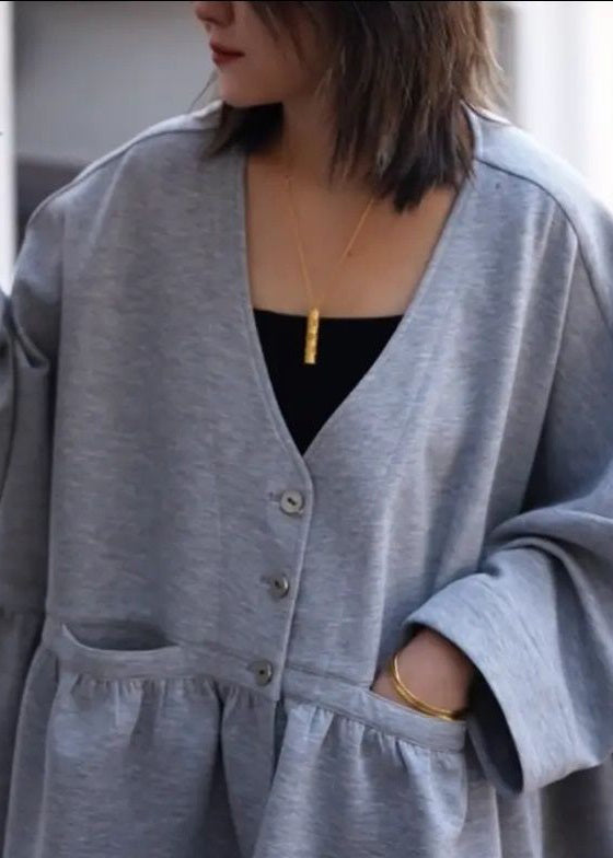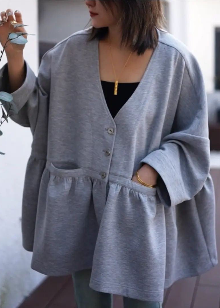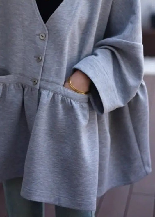 Luvik | Harmaa puuvillatakki V-pääntiellä napilla ja taskuilla