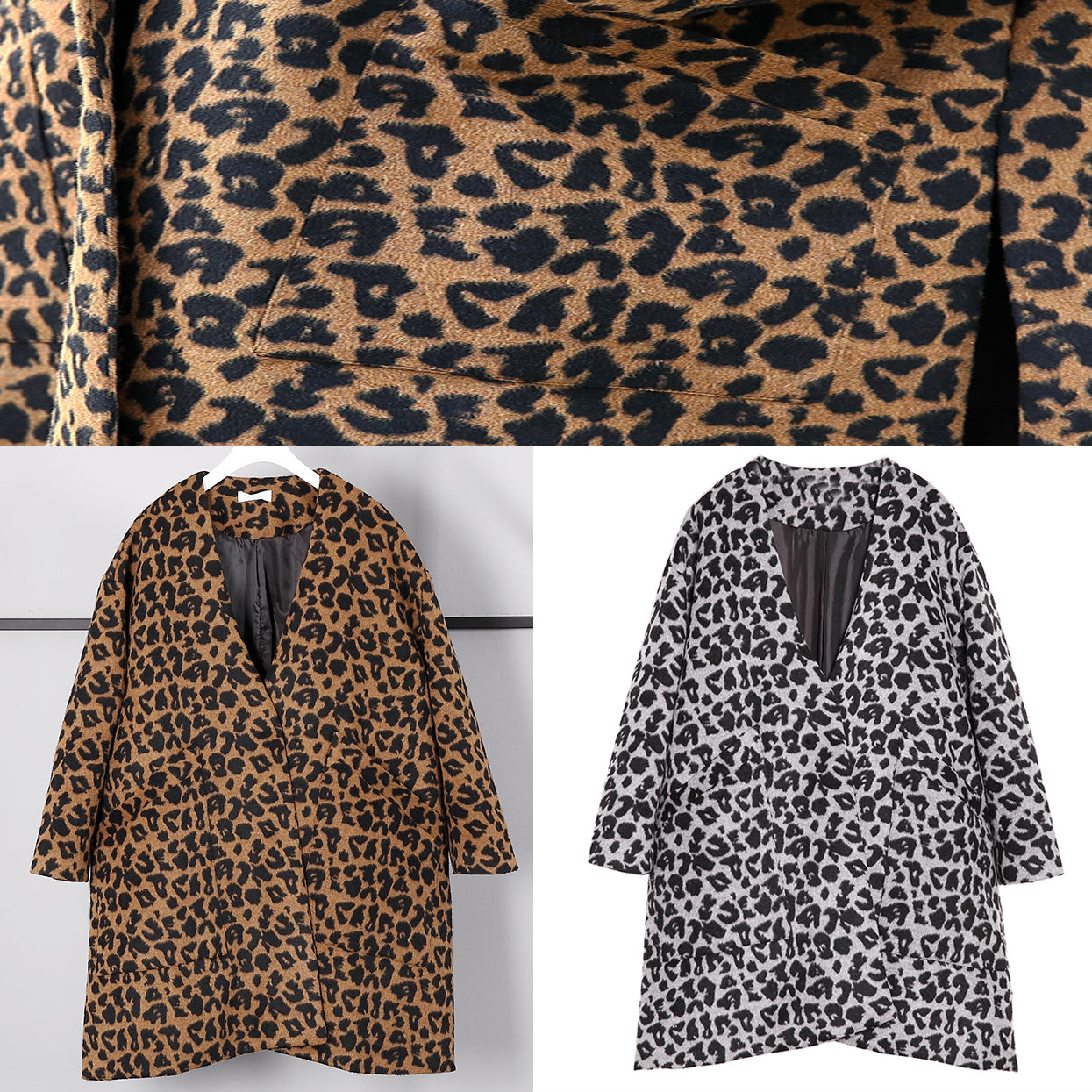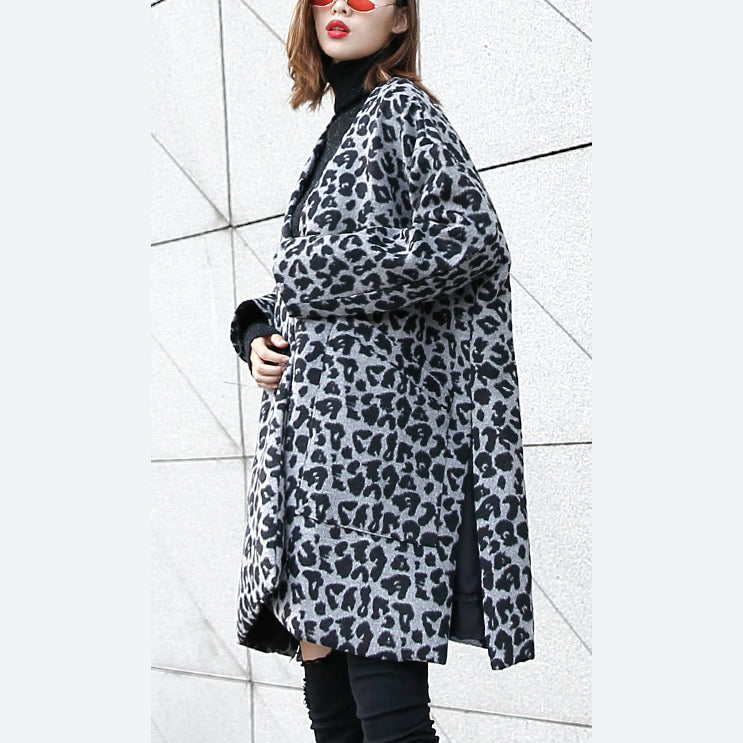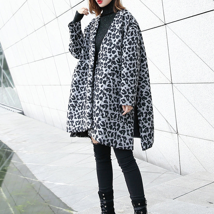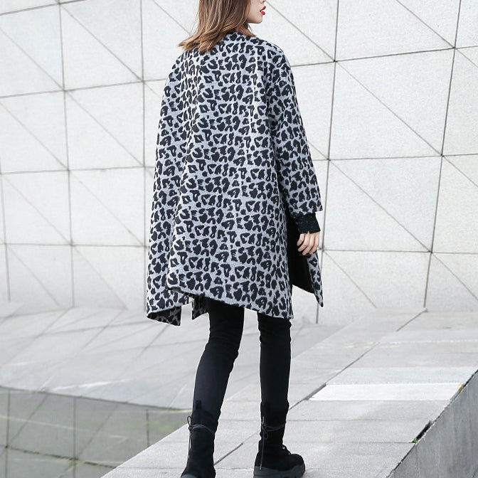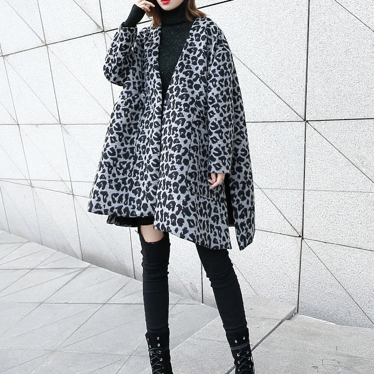 Luvik | harmaa leopardi takki suuri koko V-uoma taskut talvitakki 2025 avonainen takki sivuilla