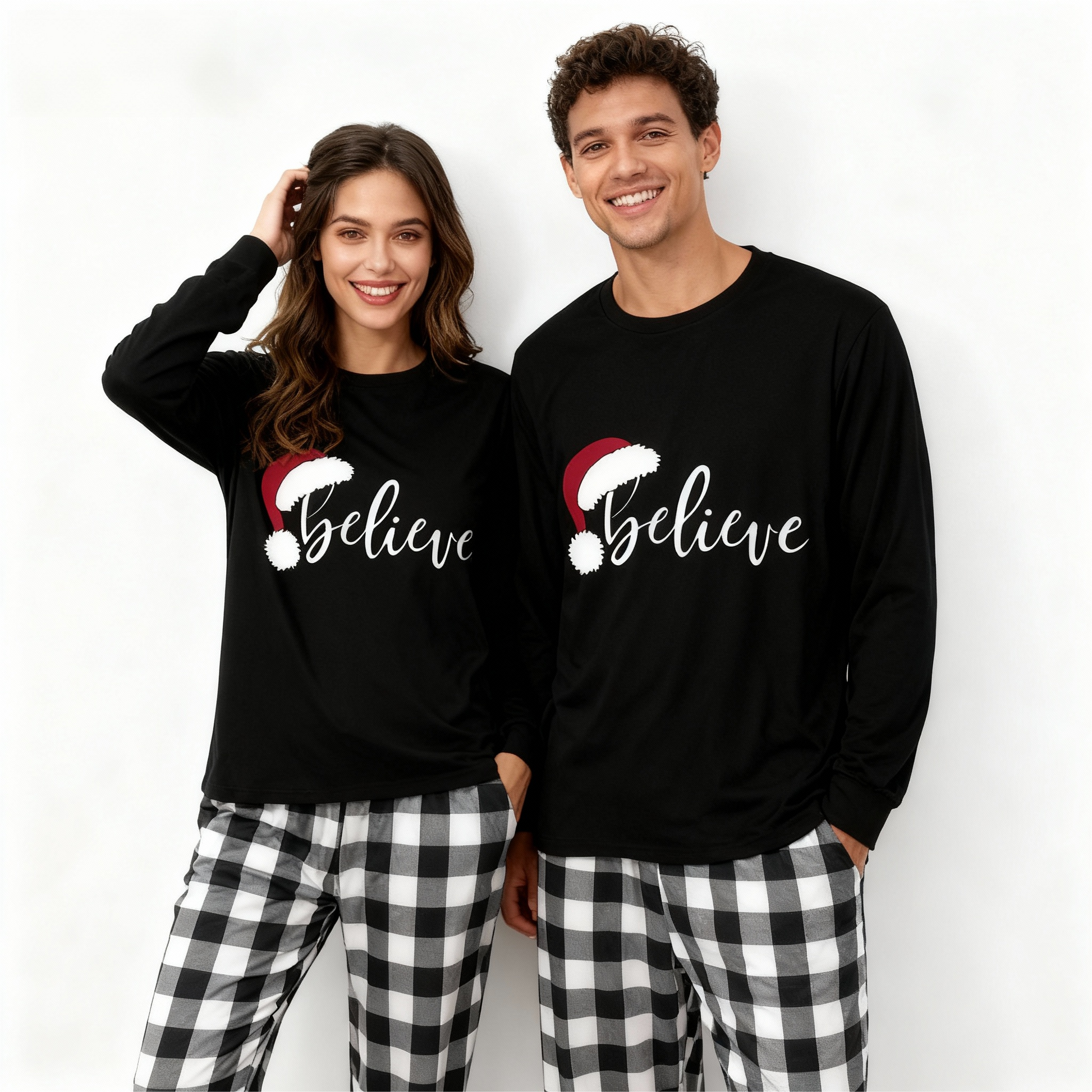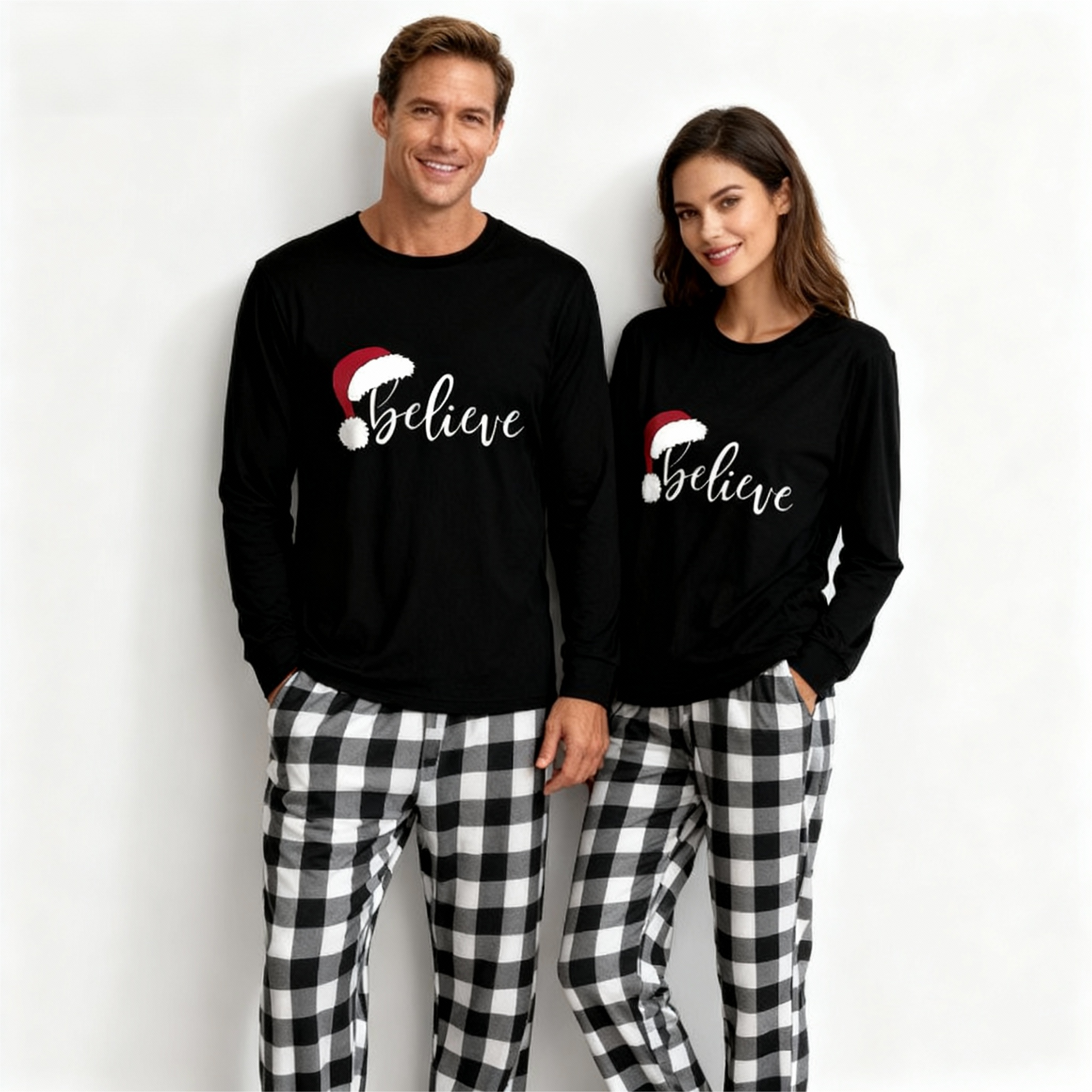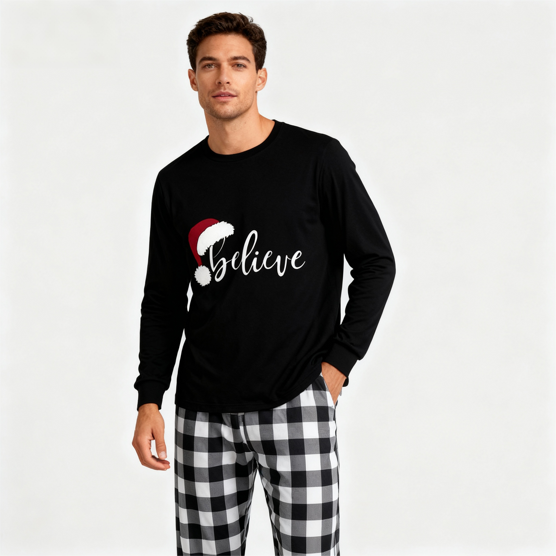 Luvik | Jouluhattu ja 'Believe' kirjainpainatus kuviollinen musta valkoinen ruututakkisetti