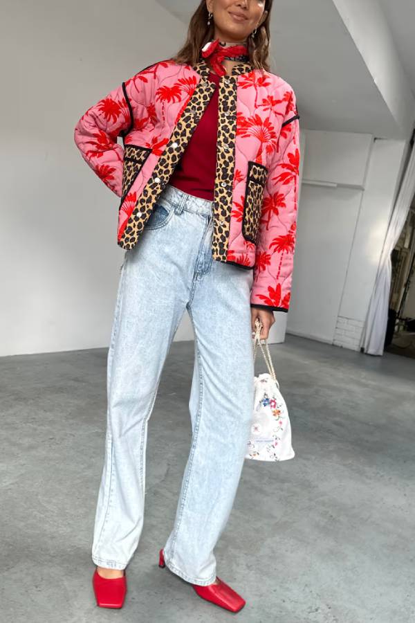 Kaksi vaikuttavaa painatusta, jotka on suunnitellut luova tiimimme pehmustetulle kankaalle. Legendaarinen "Running Wild" -mallimme klassisilla leopardi- ja palmupainatuksilla, joka voidaan muuttaa vangitsevaksi pinkki-keltaiseksi palmun designiksi, jossa on leopardi-kuvio ennen ja ykköskohdissa. Lukemattomia tapoja esitellä tätä tyyliä. Rento oversized-leikkaus yhdistyy erinomaisesti farkkuihin kylmemmillä kuukausilla.