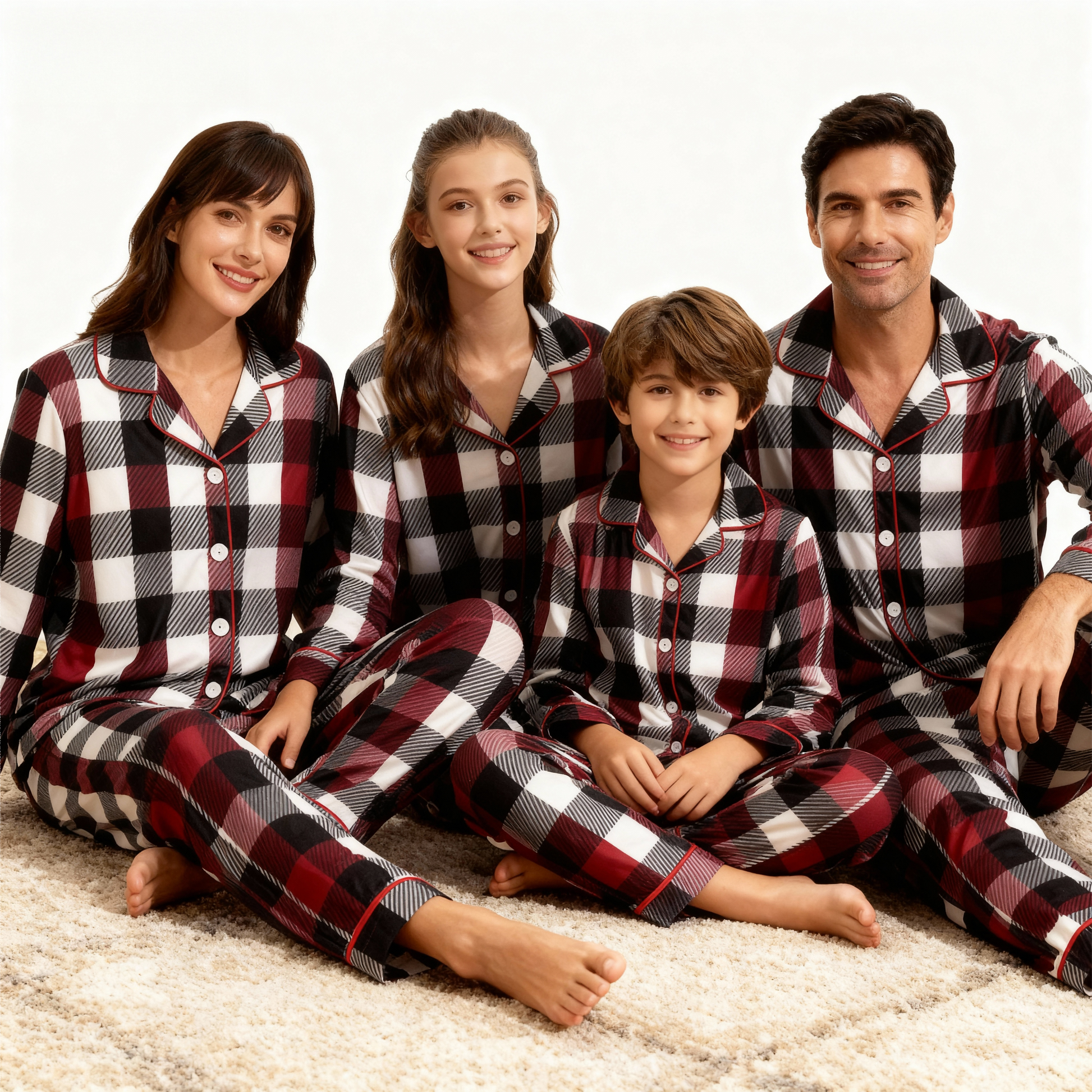 Luvik | Perhe Joulupunainen ja Valkoinen Ruudullinen Napillinen Pyjama Setti
