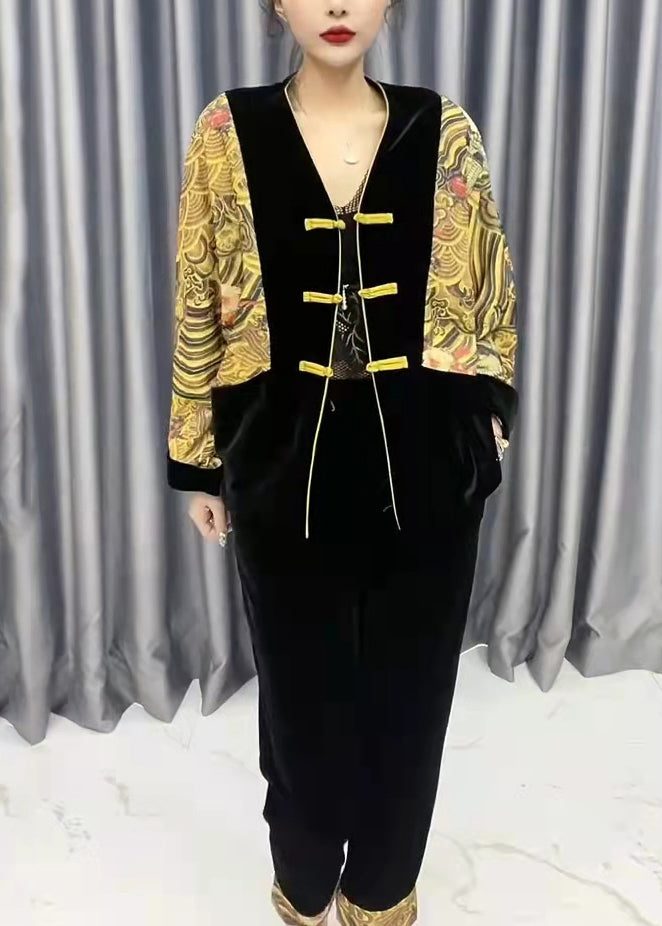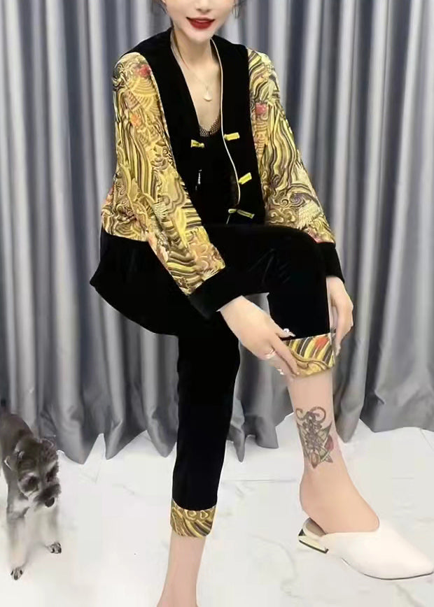 Luvik | V-kaulus keltainen silkki-veluuripatchwork-kuvioinen crop-takki ja housut Kaksiosainen asu