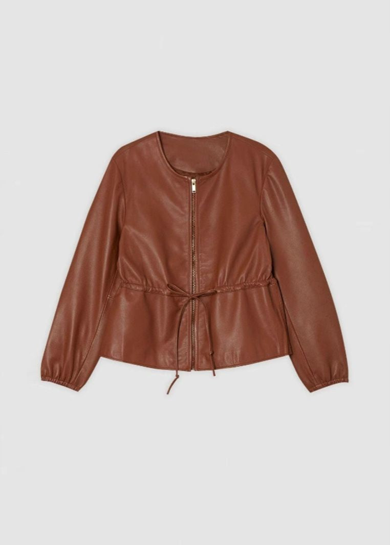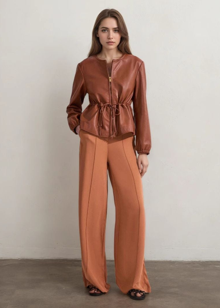 Luvik takki yhdistää puhtaat linjat pehmeään tekstuuriin selkeässä, minimalistisessa muodossa. Valmistettu korkealaatuisesta tekonahasta, jossa on viehättävä konjakkihehku, se sisältää tyylikkään vetoketjun, pyöreän kaula-aukon ja säädettävän nyörin vyötäröllä, joka takaa imartelevan istuvuuden. Se on kevyt ja vuoreton, mikä tekee siitä täydellisen kerrospukeutumiseen siirtymäkausina tai yhdistettäväksi korkeavyötäröisten housujen kanssa päivittäistä eleganttia ilmettä varten.