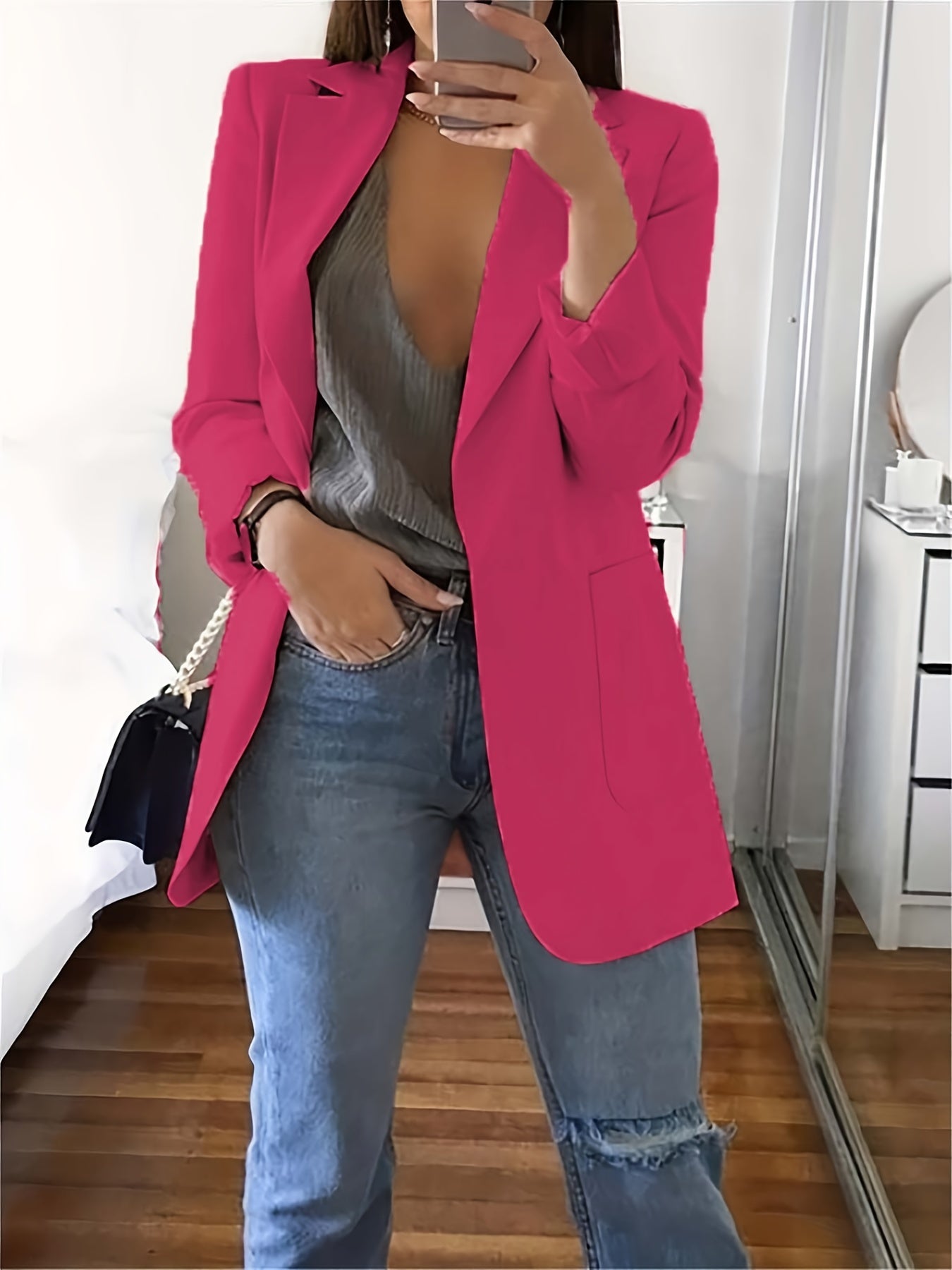 Tämän bleiserin klassinen muotoilu lisää eleganssia jokaiseen asusteeseen. Pue se tunikan päälle saadaksesi tyylikkään ilmeen toimistolle tai heitä se rennosti t-paidan päälle saadaksesi rentoa tyyliä. Leikkaus on tehty mukavuuttasi varten, jolloin voit tuntea olosi hyväksi ja itsevarmaksi koko päivän.