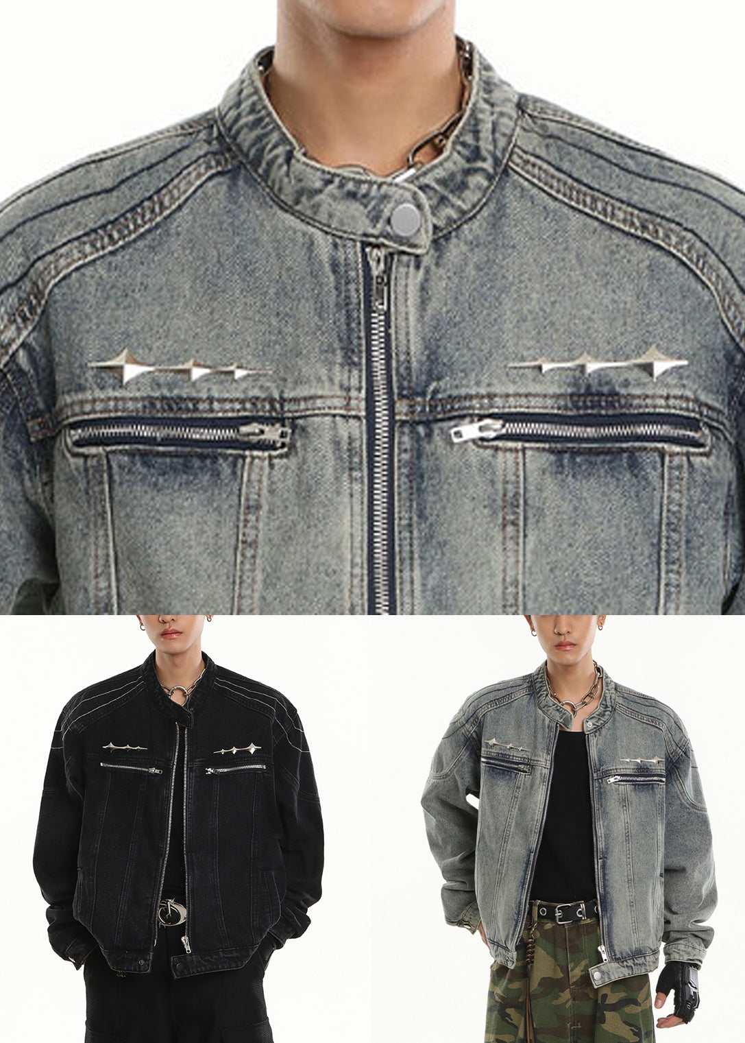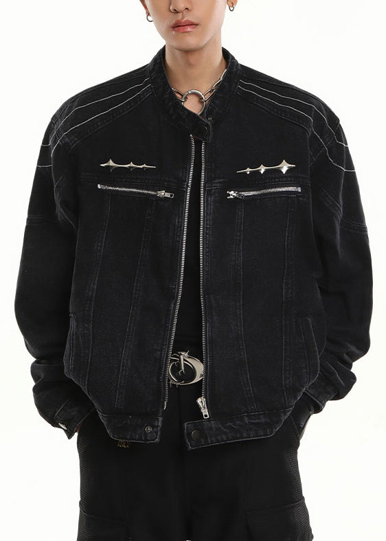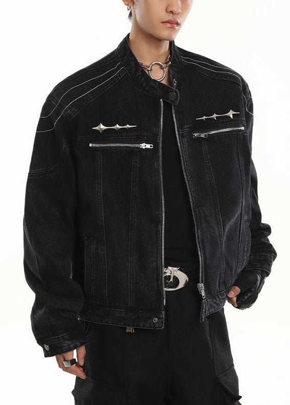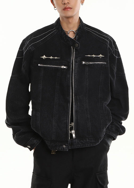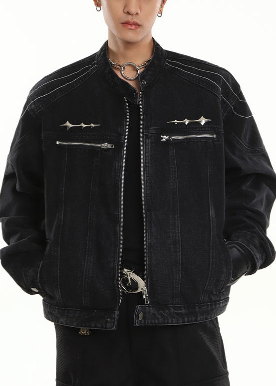 Luvik | Mustat farkkutakit miehille korkealla kauluksella, vetoketjulla ja taskuilla