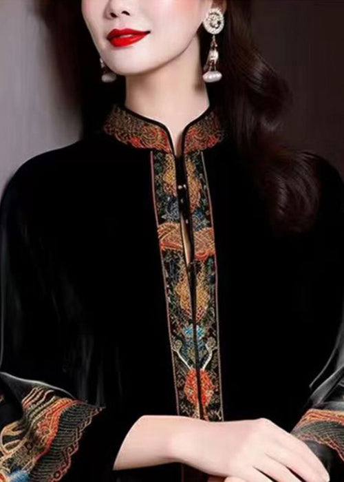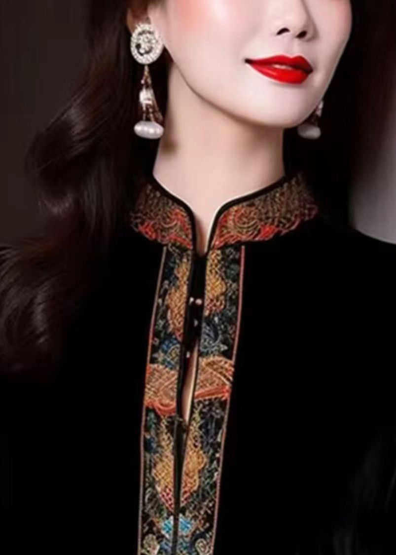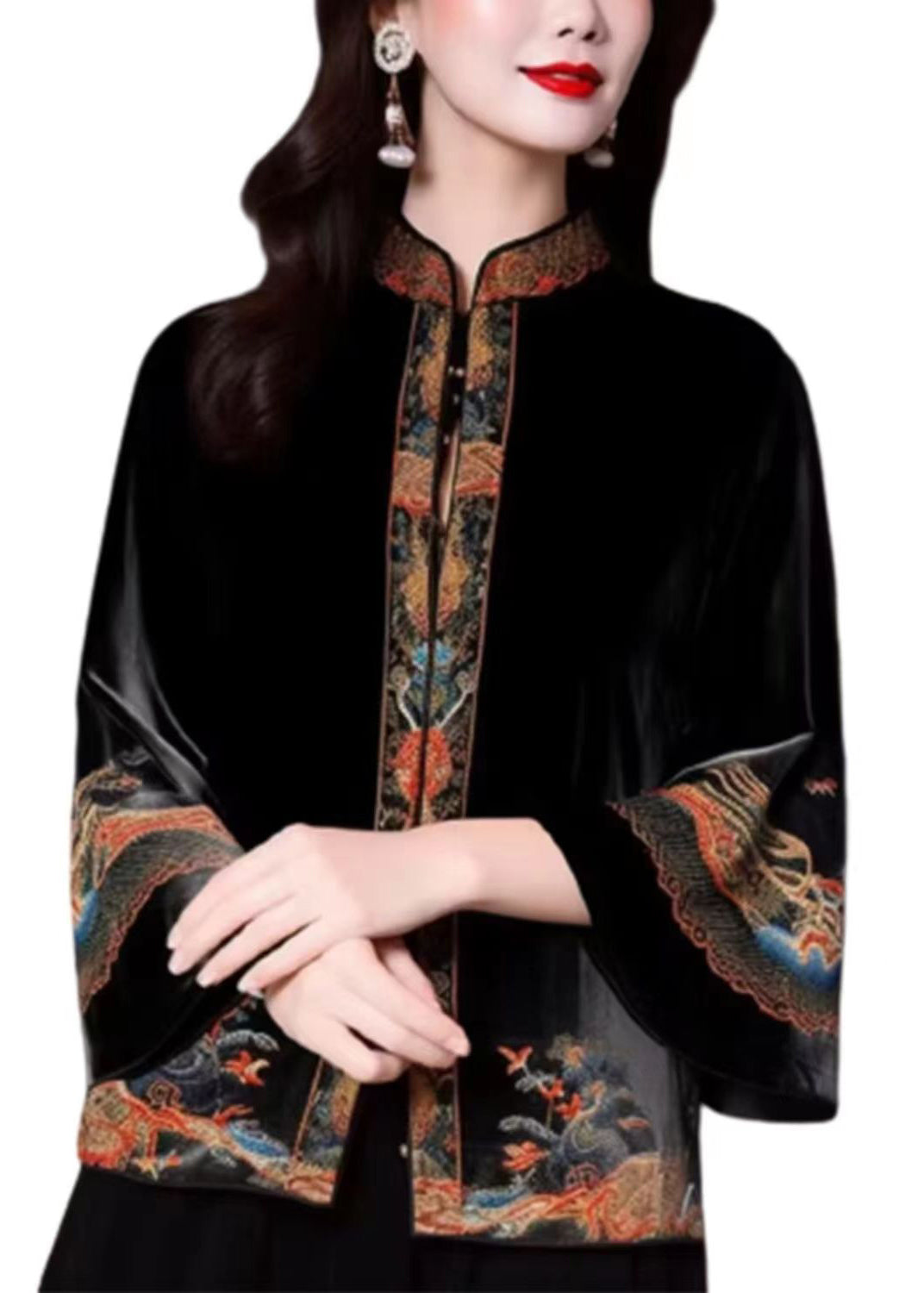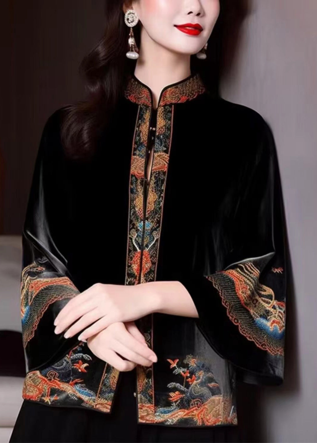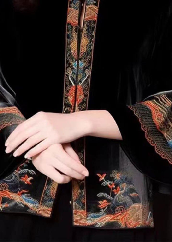 Luvik | Silkkiveluurista valmistetut brodeeratut takit, joissa on korkea musta kaulus ja levenevät hihat