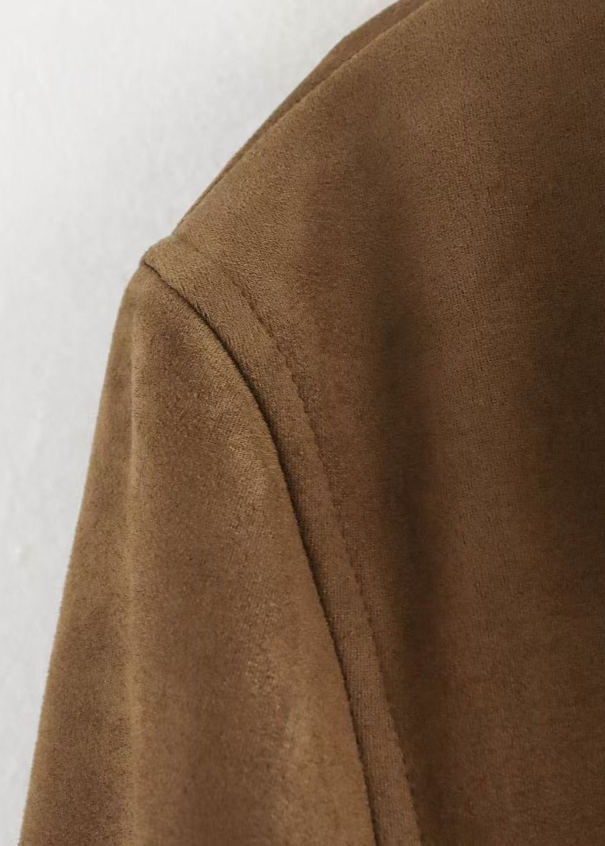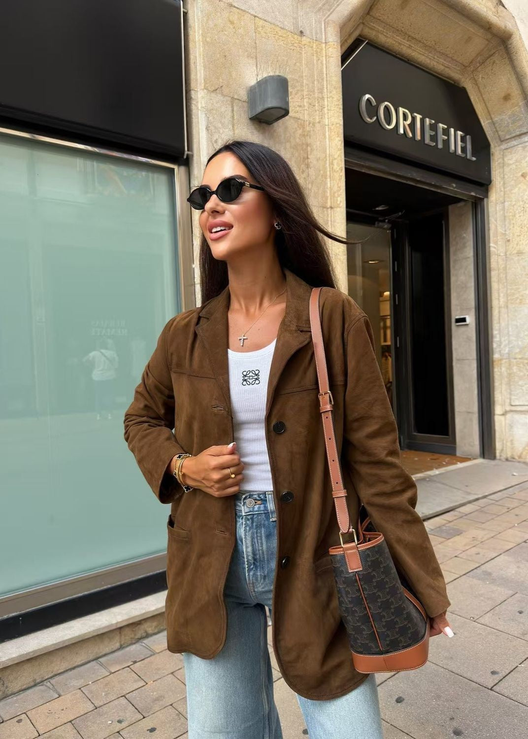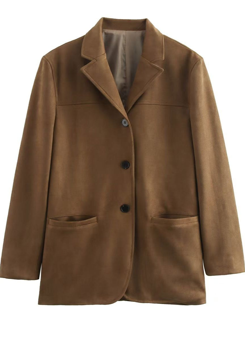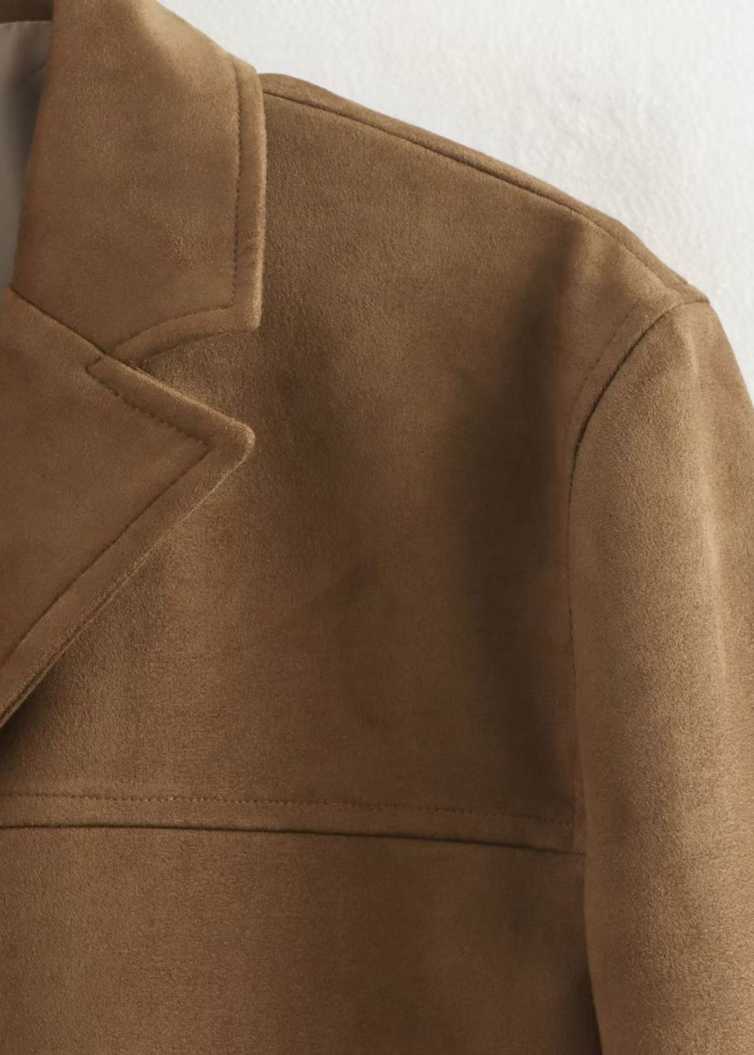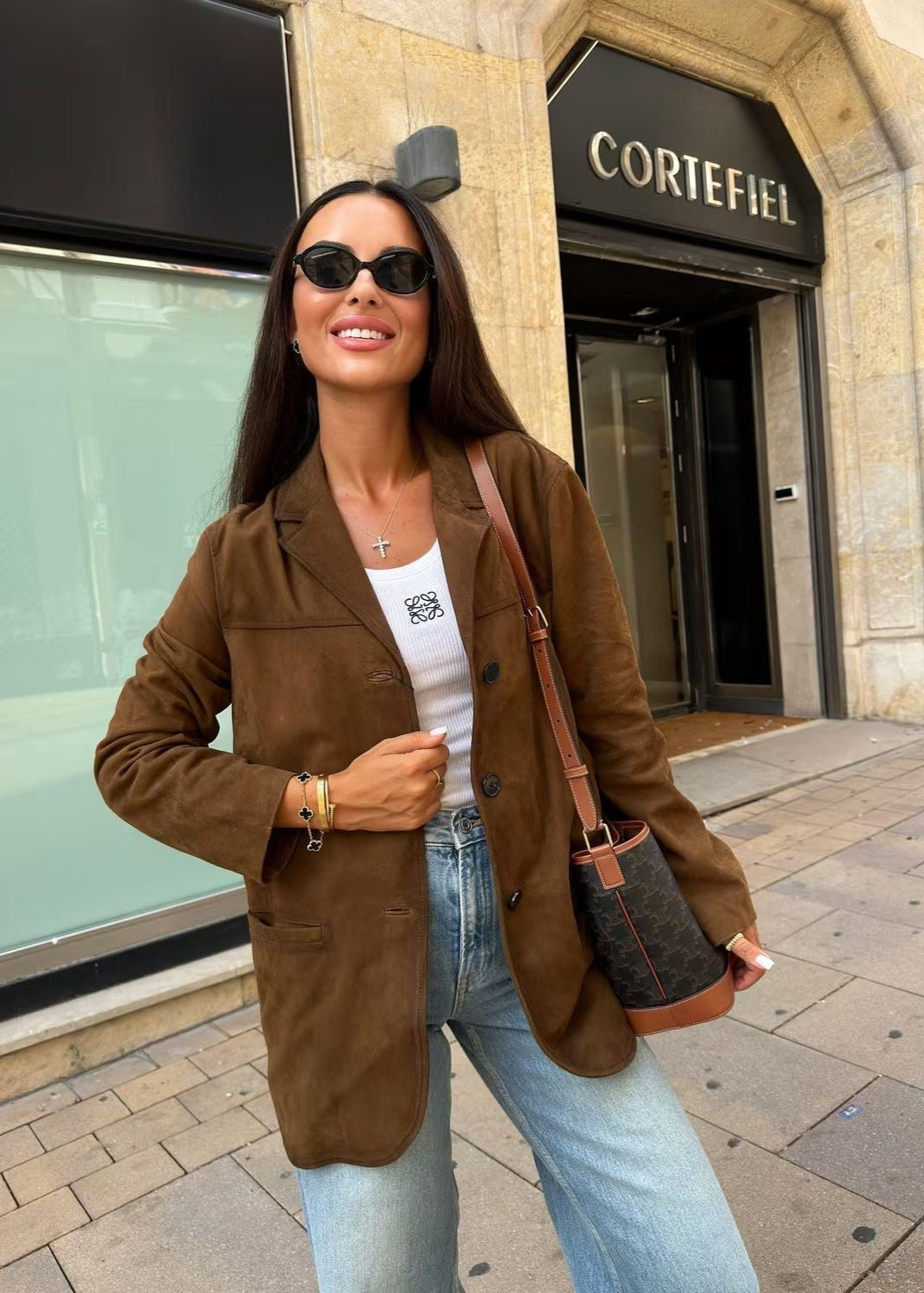 Luvik bleiseri edustaa eleganttia tyyliä rentoihin tilaisuuksiin pehmeän nubukki-pinnoitteensa ja selkeästi muotoilunsa ansiosta. Suunnittelussa on yksirivinen suljenta, klassiset läpäreet ja käytännölliset tikkipockets, mikä tekee tästä kappaleesta sekä tyylikkään että sopivan päivittäiseen käyttöön. Pehmeä nubukki-kangas huokuu ripauksen vintage-sophistikoituneisuutta, kun taas hieman oversized-leikkaus tarjoaa rennon eleganssin – täydellinen yhdistettäväksi shortseihin, housuihin tai kerroksena mekkojen päälle.