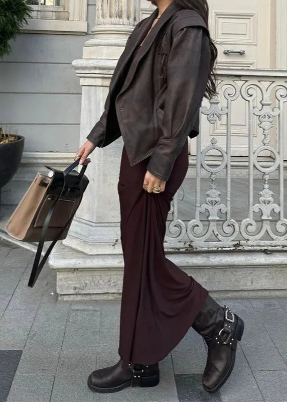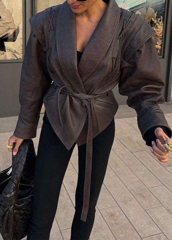 Luvik - keinvalkoista keinokuitua, jossa on nauhavaihtoehtoja, tuo modernia eleganssia ylätuotevalikoimaasi. Laadukkaasta keinonahasta valmistettu tämä vyötäröltä kapeneva malli hurmaa näyttävillä nauhoilla olkapäillä, epäsäännöllisellä helmalla ja hienostuneella, vyötä ympäröivällä leikkauksella, joka luo imartelevan siluetin. Leveä käännekaulus antaa takille rakennetta ja tekee siitä näyttävän osan sekä päivittäiseen että iltapukutilaisuuteen. Yhdistä se tiukkojen housujen tai tyylikkään mekon kanssa rohkeaksi, itsevarmaksi esiintymiseksi.