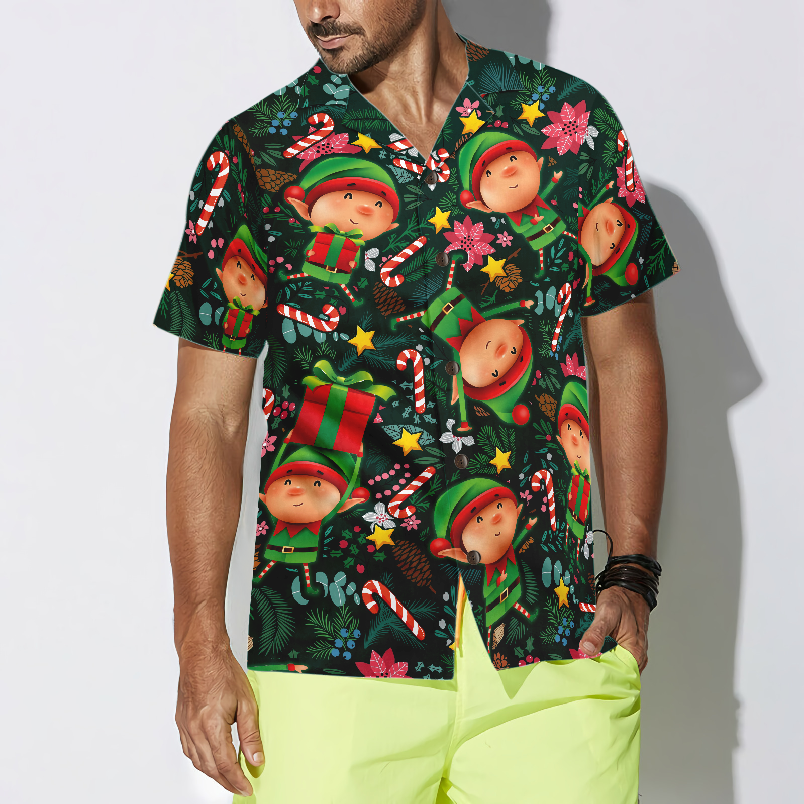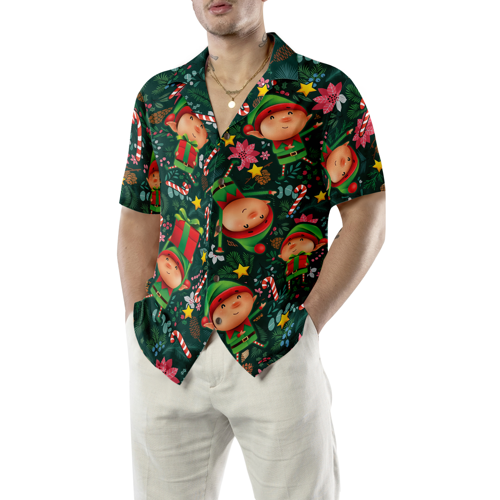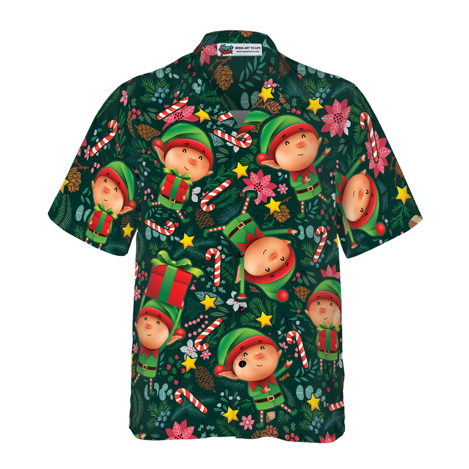 Luvik | Hawaiipaitoja Joulun Hyperfavor, Lyhythihainen joulutonttu-paita tummanvihreällä kuviolla, Joulupaitalahja-idea miehille ja naisille