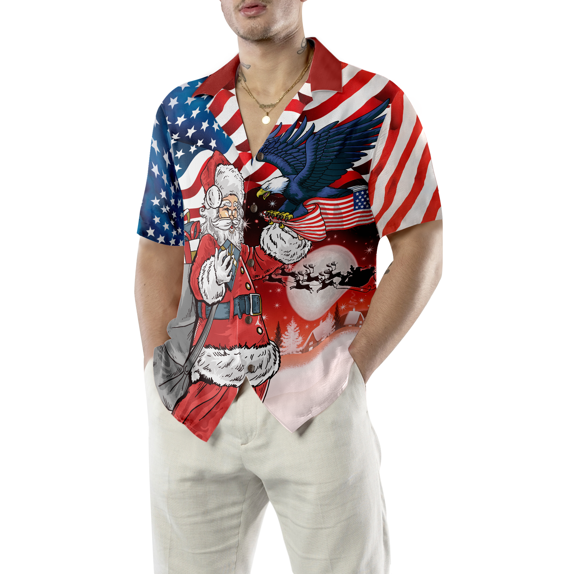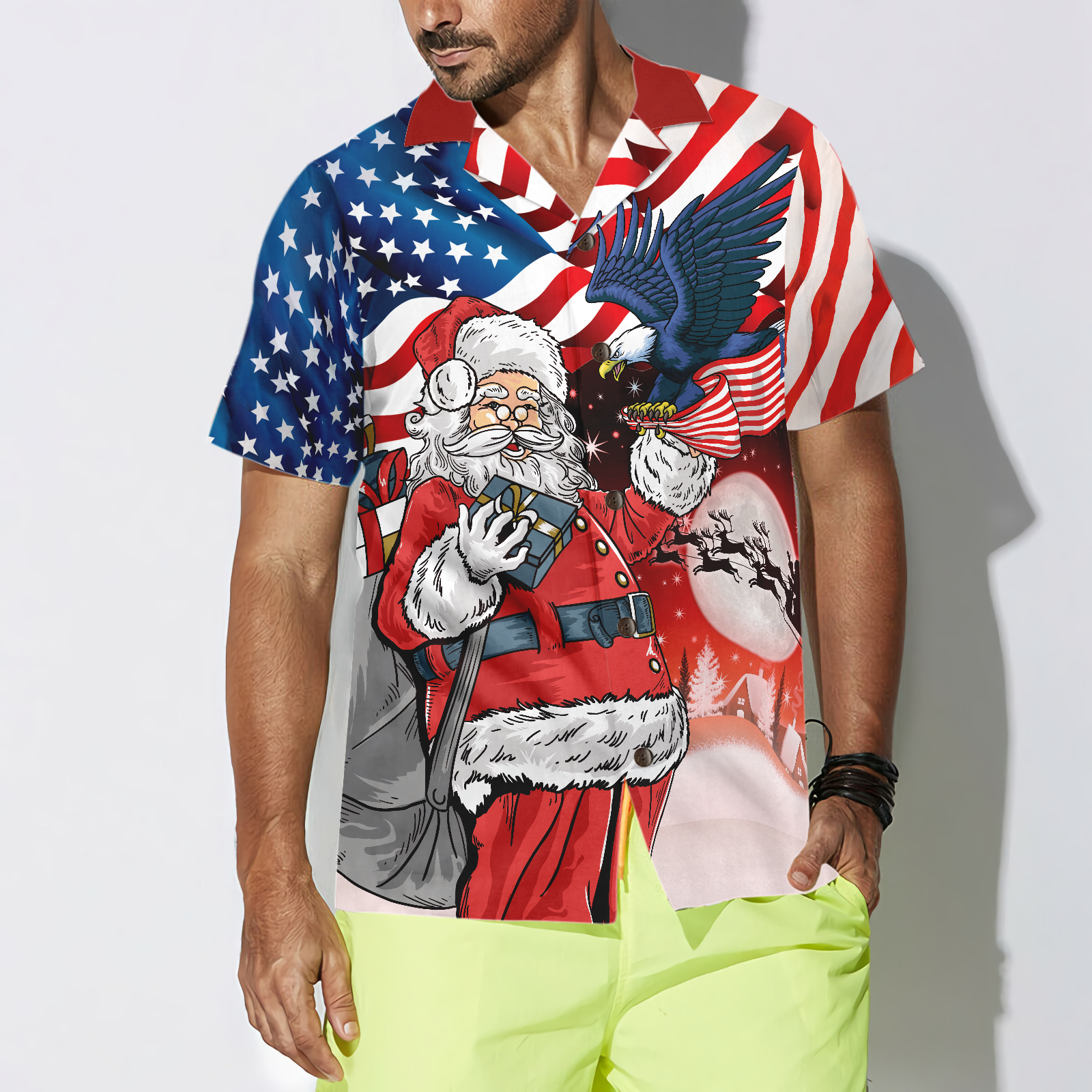 Luvik | Aigle, isällä joulupukin kädellä amerikkalainen lippu, hawaijipaita, joulupaita lahjaidea miehille ja naisille