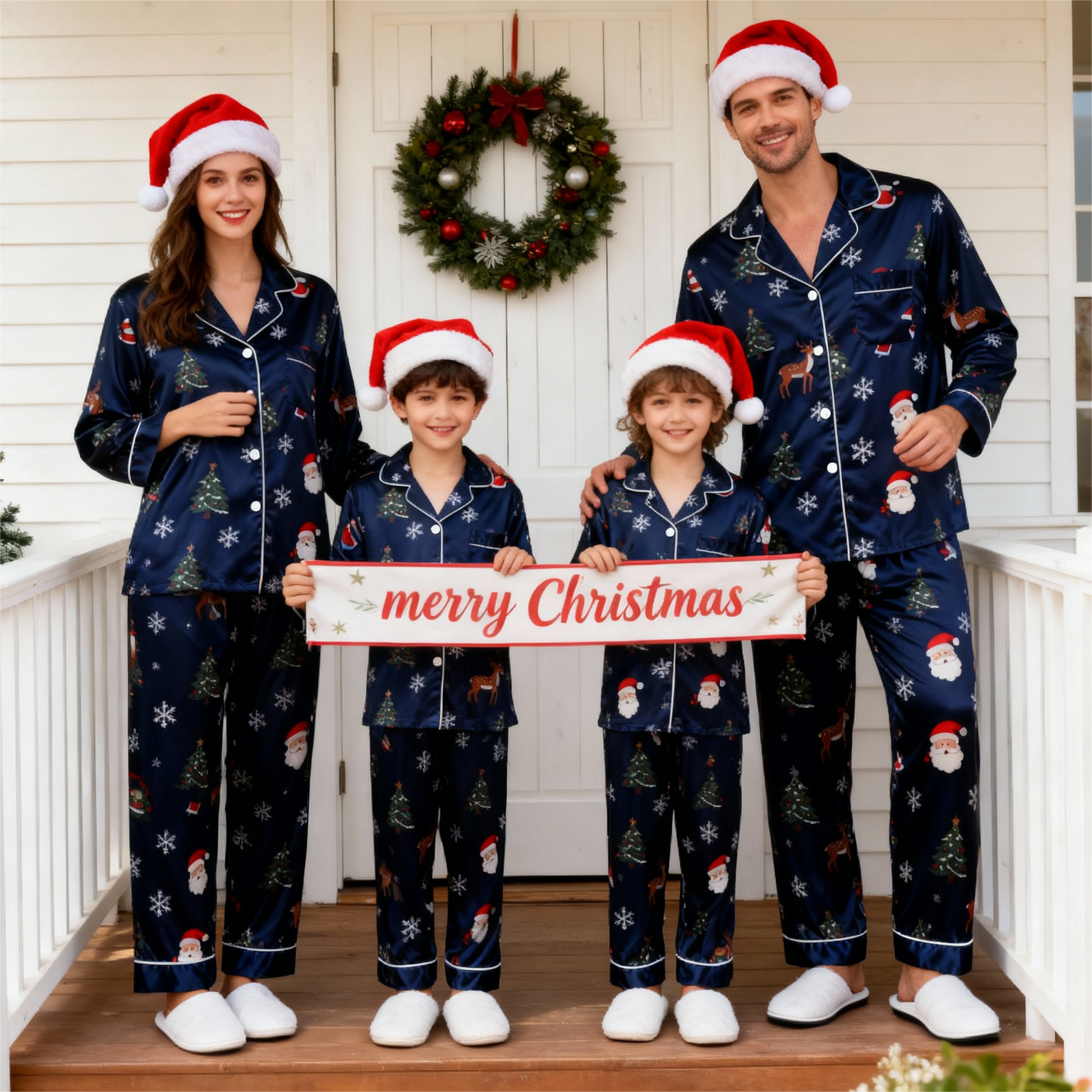 Ylellinen satiininen perhepyjama-setti – Lisää ripaus hienostuneisuutta uneen liittyvääsi tämän upean samansuuntaisen satiinisen pyjamavarusteen avulla koko perheelle! Suunniteltu yhdistämään mukavuus ja tyyli, tämä setti sisältää: