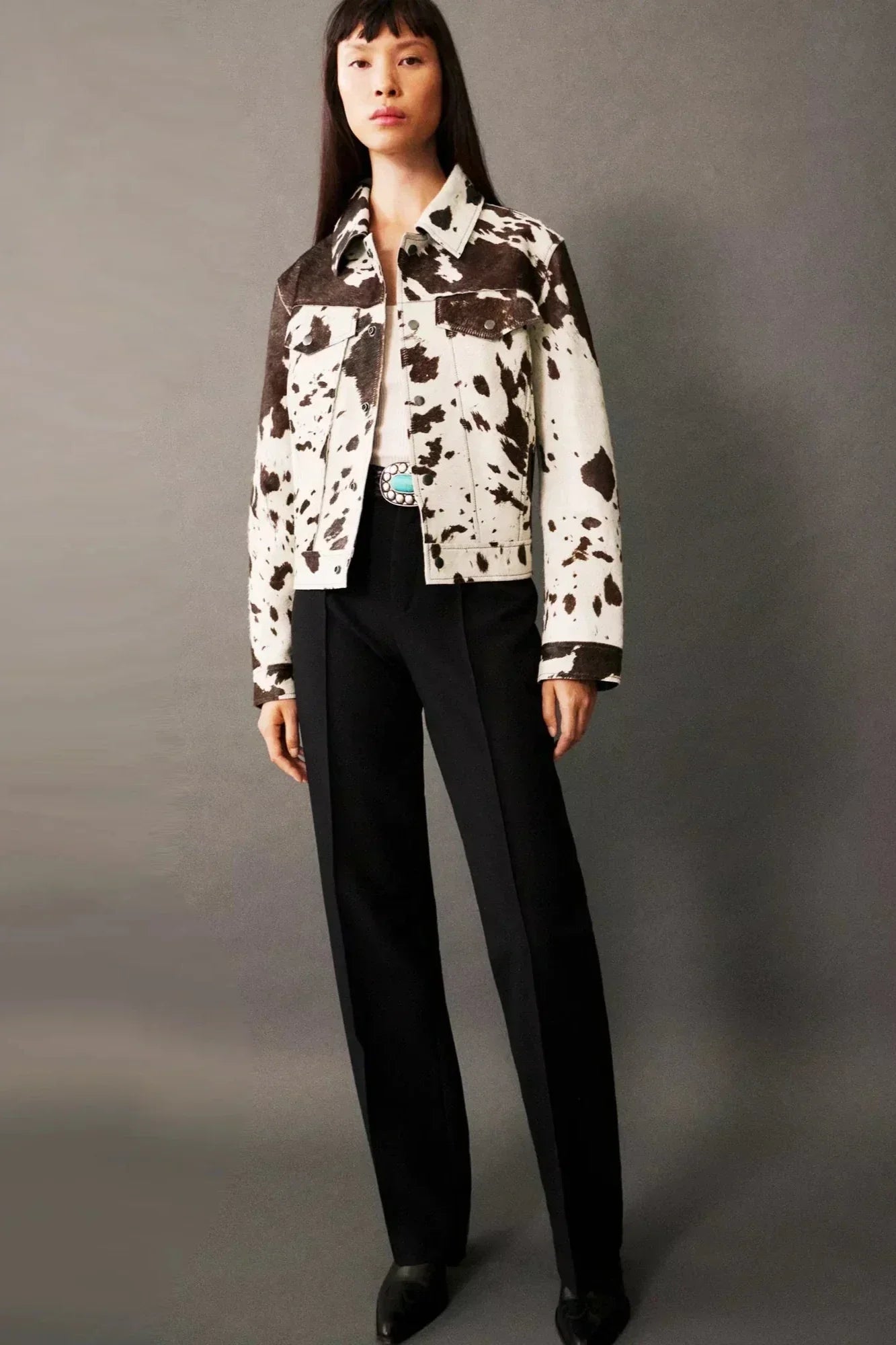 Tämä muodikas takki on valmistettu korkealaatuisesta tekoturkista ja välittää pehmeän ja ylellisen tunteen. Sen suunnittelu sisältää uskomattoman yhdistelmän luvik-printtiä ja eläinkuvioita, mikä lisää villiä eleganssia vaatekaappiisi. Suoran leikkauksen ja kauluspainikkeen ansiosta takki yhdistää kaupunkimuodin luonnollisiin yksityiskohtiin. Se on varustettu kahdella käytännöllisellä läpällisellä rintataskulla ja koristeompeleilla, jotka lisäävät ylimääräistä viehätysvoimaa. Pitkissä hihoissa on nappimansetit, ja vuori tarjoaa lisämukavuutta ja lämpöä.