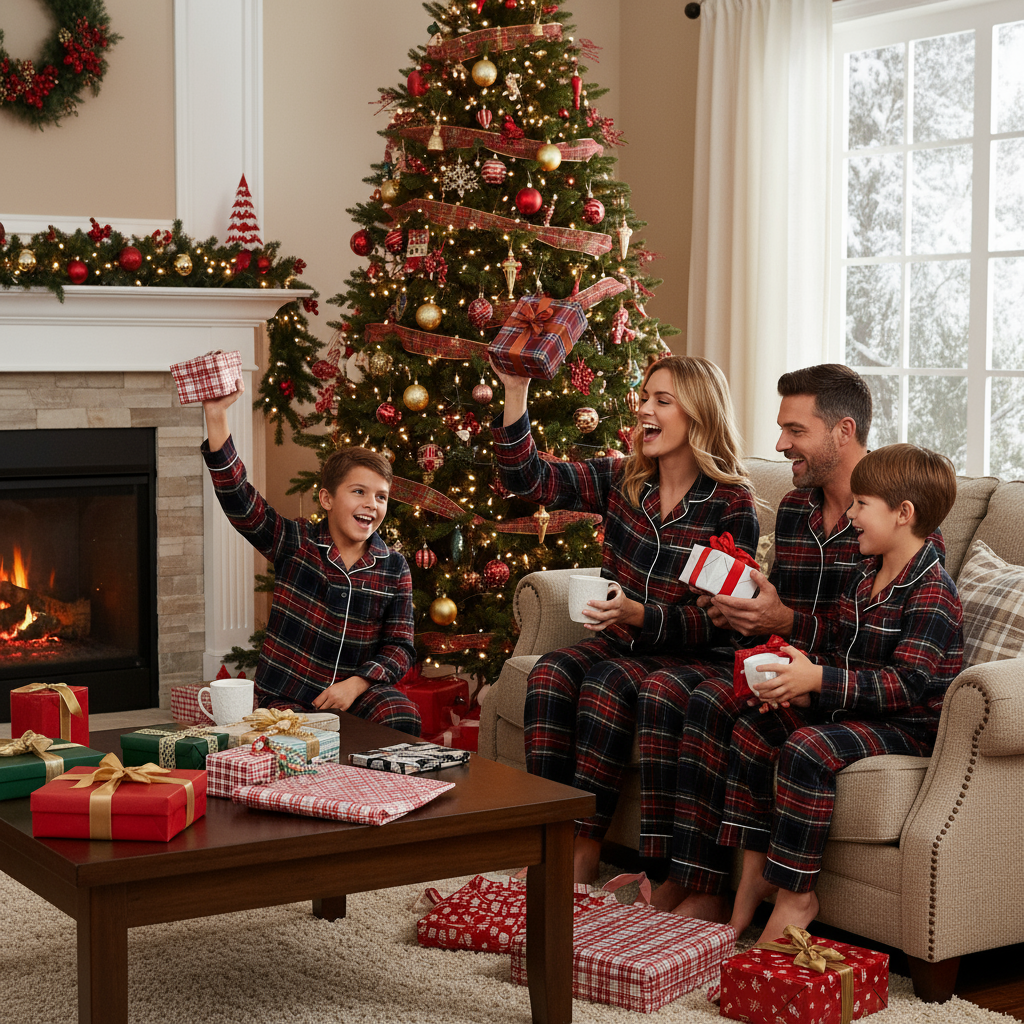 Pukea koko perheelle juhlaväriä meidän Klassiset Ruudulliset Luvik Pyjamat! Nämä pyjamat on valmistettu korkealaatuisesta 70% puuvillasta ja 30% polyesteristä, tarjoten täydellisen yhdistelmän pehmeyttä, hengittävyyttä ja kestäväisyyttä – pitäen kaikki mukavina luvik-illasta rentoihin talviaamuihin.