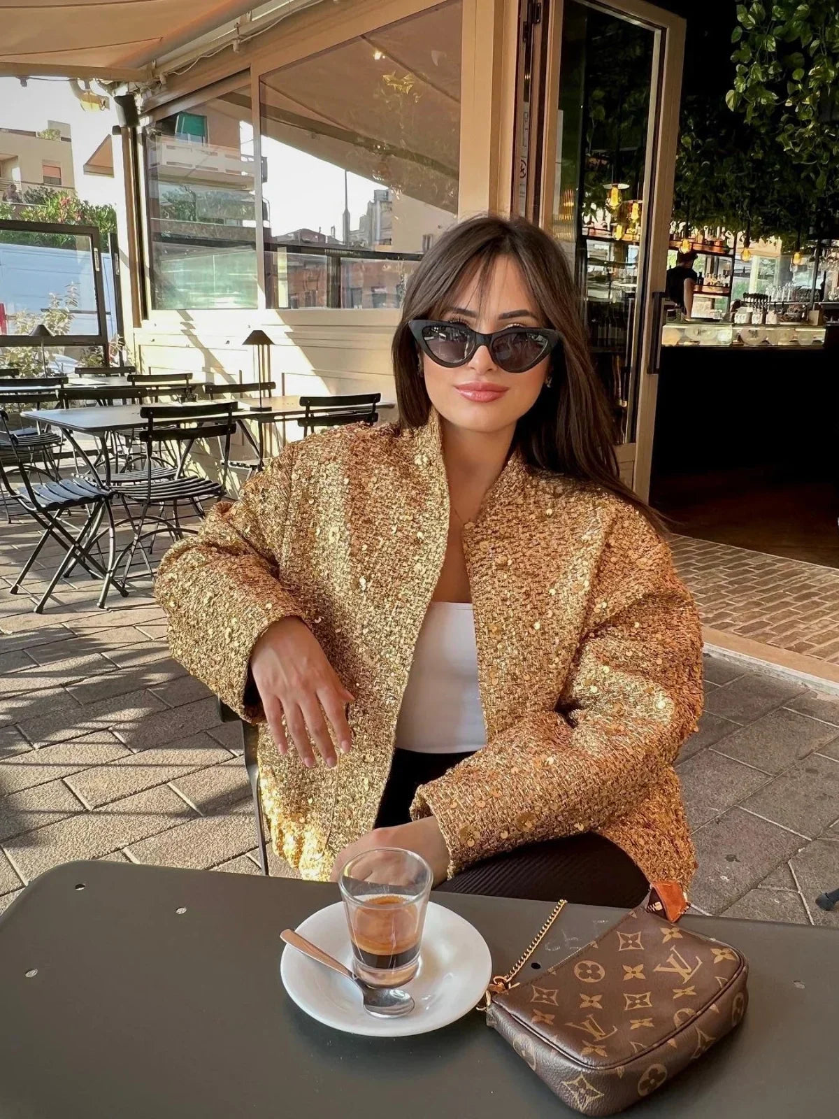 Tämä tyylikäs statement-kappale on suunniteltu niille, jotka rakastavat olla huomion keskipisteenä. Siinä on silmiinpistävä, täysin koristeellinen strassikuvio, joka heijastaa kimaltelevaa valoa jokaisen liikkeen myötä. Sen löysä ja leveä leikkaus sekä lyhyt pituus yhdistävät glamourin rentoon mukavuuteen.