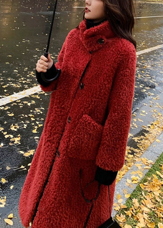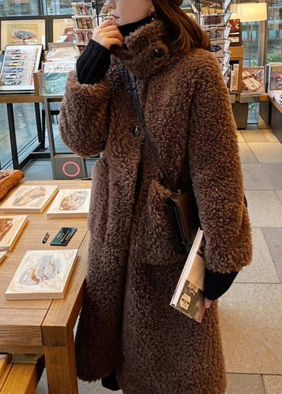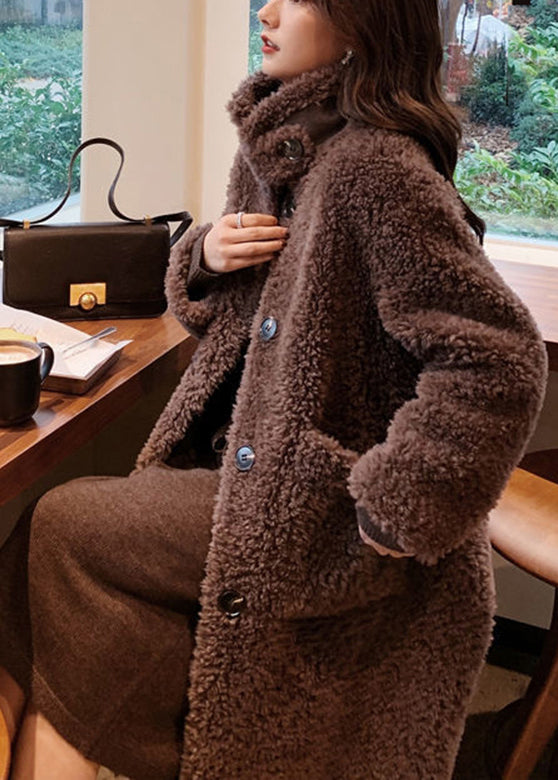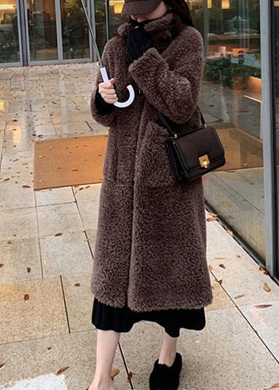 Luvik | Maxitakki suklaanvärisestä tekokarvasta, jossa on korkeakauluspanta ja napit talveksi