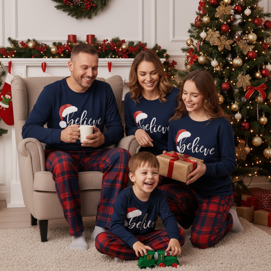 Luvik | Joulun "Usko" Kirjainpainatus Sininen Pitkähihainen Paita Punaisilla ja Sinisillä Ruudullisilla Joulun Perhetyyppisillä Pyjamilla
