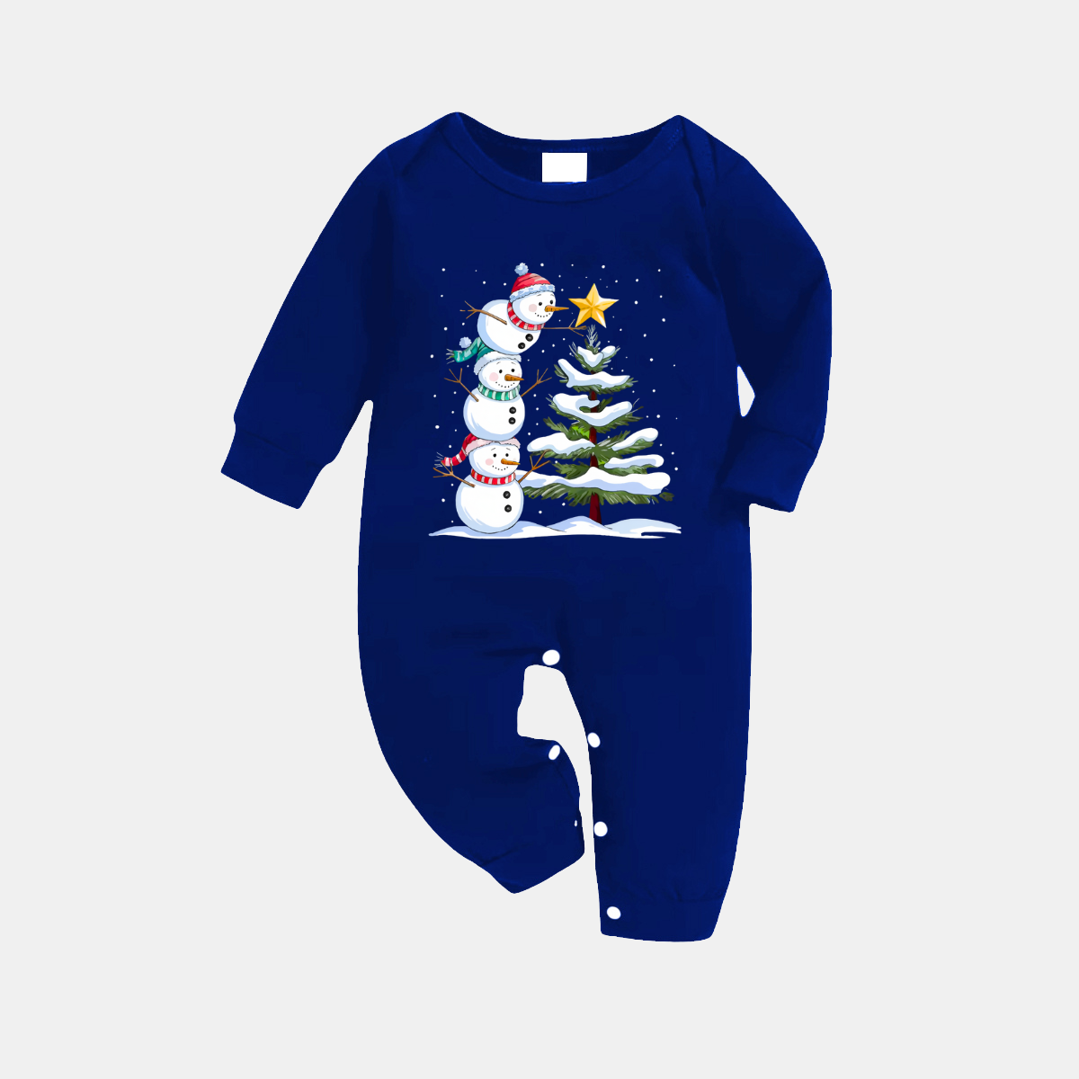 Luvik | Tummansininen ja valkoinen ruudullinen joulu pyjama kolmiosainen setti, jossa on lumiukko ja joulukuusen painatus