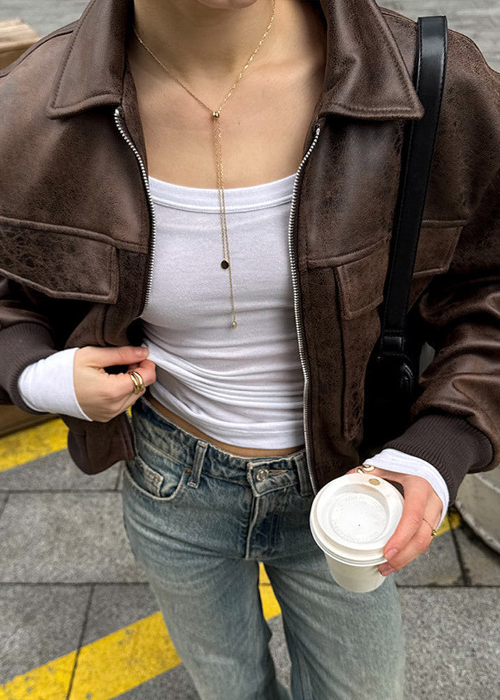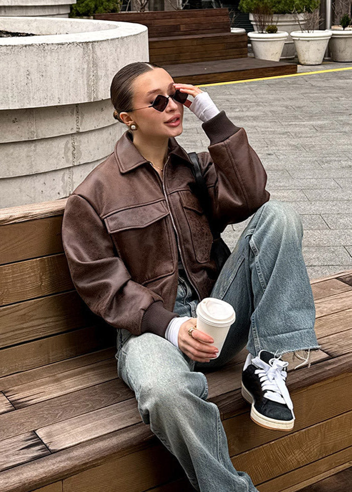 luvik-takki tuo vintage-tyylillään rentoa ja tyylikästä ilmettä. Se on valmistettu revitystä keinonahasta ja siinä on lyhyt, laatikkomainen leikkaus, jota täydentävät utilitaristisesti sijoitetut läppätaskut ja koko pituinen vetoketju, jossa on O-renkaan yksityiskohta. Ribbausvarret ja helma tarjoavat hienovaraisen rakenteen, kun taas mukava vuori tekee takista miellyttävän päivittäin. Ihanteellinen tanktopin tai hupparin päälle, tämä takki kohottaa jokaista rentoa asukokonaisuutta – täydellinen vaihtelevaan säähän ja kerrostamiseen katutyylissä.